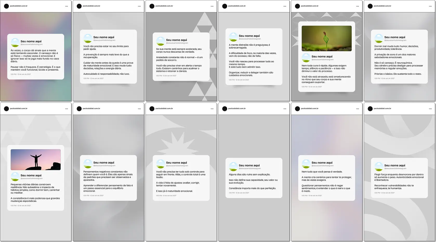 Pack de posts editáveis no Canva para psiquiatras que produzem conteúdo sobre saúde mental, transtornos psiquiátricos, diagnóstico clínico e acompanhamento médico, mantendo um feed organizado e confiável.