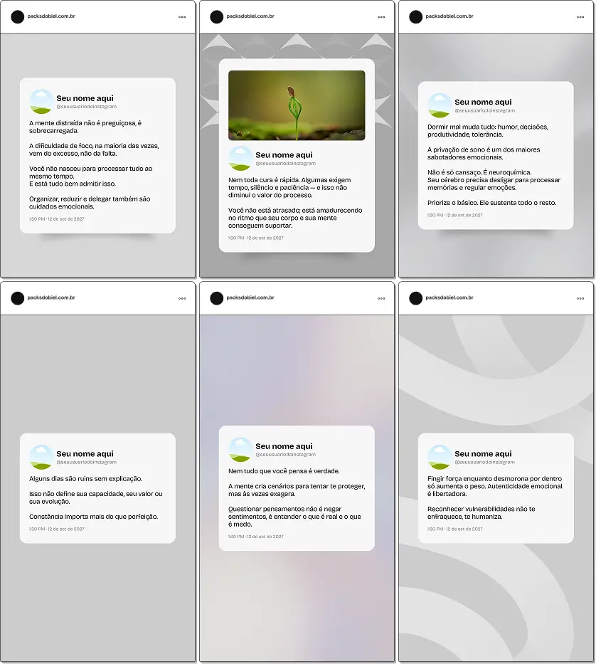 Quem compra um Pack geralmente busca posts e artes que se identifiquem e combinem com seu perfil. Cada produto, seja meu ou de outro criador, tem um visual próprio.
